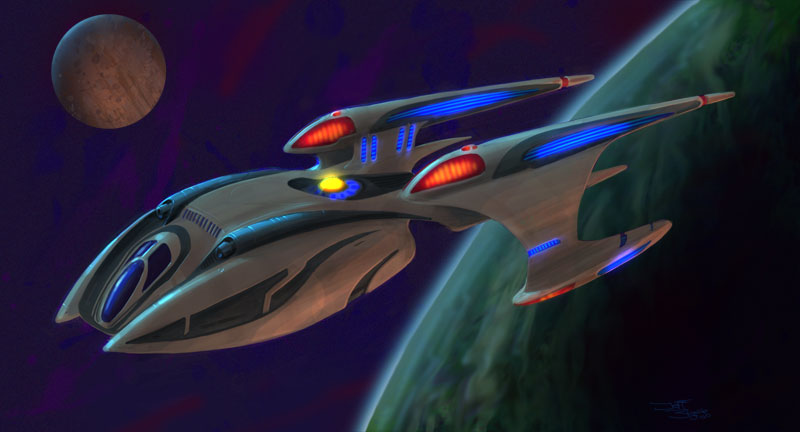 At the Bloodfire booth, Wacom lent Lee a Cintiq 20 tablet monitor, which I got to spend some quality time playing with, resulting in this Star Trek type ship painting: