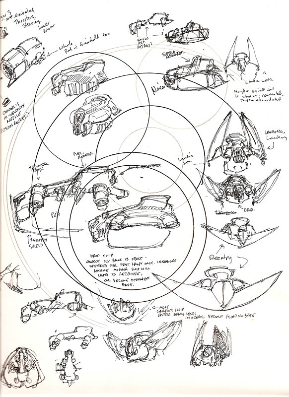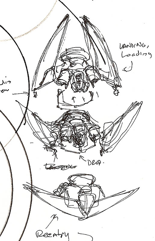 In the first sketch, you see none of that. It's just not an exciting drawing, and it completely fails to show the most important aspects of the ship's function which is plainly clear in the scribble showing the different wing configurations. And really, it doesn't show the overall shape of the ship very well, you can see that the body of the ship is just kind of a blob of shapes in an uninteresting, almost rectangular outline. It is, frankly, kind of boring apart from a few details here and there. I made the deadliest mistake - I didn't tell the story that I wanted to.