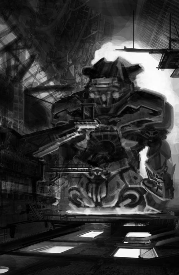 Looks like it's reading pretty well. I need a bit more of a gradient from bottom to top on the robot figure, the upper parts seem like they're reflecting more of the lower light source than they should. It's not as obvious in the color version but it's very plain here. The lighting won't look realistic if it doesn't fade naturally with distance from the source, so I will need to deal with that as I go forward.