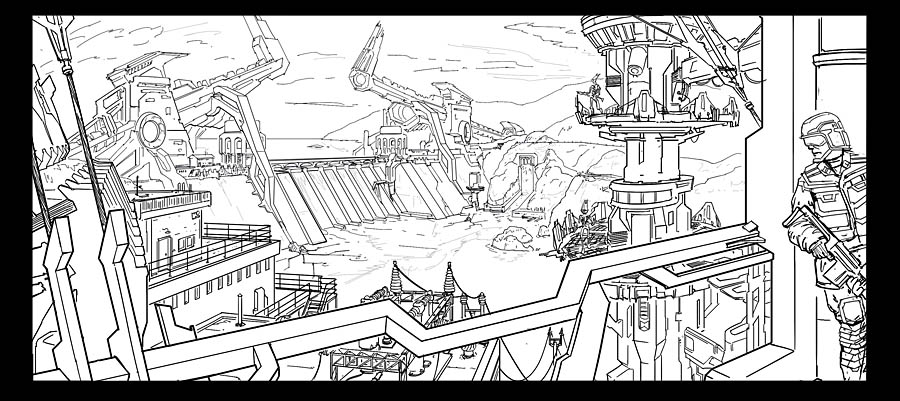 It's some kind of alien energy amplifier installation that's piggybacked on a hydroelectric dam in the American Southwest. They're stealing our power to build a hyperspace bypass! At right is our human stealth soldier who's trying to infiltrate the plant and destroy it.