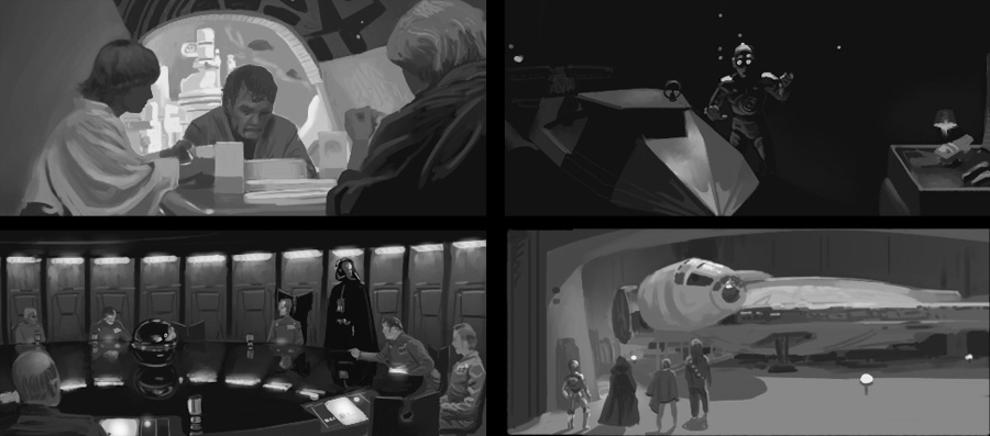These were fun and I learned a lot of things from them about lighting and value arrangement, and there's a lot of really interesting details of how the shots are staged and lit that were fun to discover. You may not like George Lucas's scripts much (and they have some appalling moments), but the guy really does (or at least did) know how to compose a shot. And of course Brad Bird's work on Incredibles is absolutely flawless, so it doesn't hurt to learn from the master.