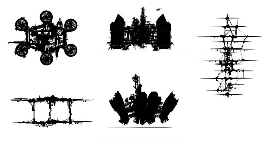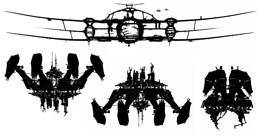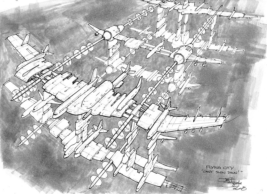Here's a couple drawings I did for class, line art design sketches of a couple of the ideas from last weeks thumbnails. First is a flying city cobbled together out of large aircraft and various parts; it would be assembled "on the fly" in midair and could never land: