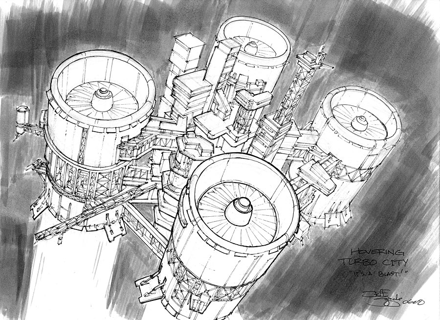 The second is a hovering city that's built around huge turbofans that hold it up in the air: