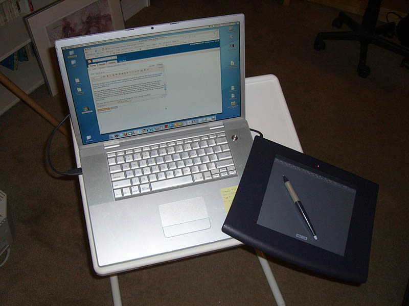 It's a MacBook Pro 17". It now has every bit of software on it that I need to do everything that I do with a computer, except for music recording. So with this, my Wacom tablet, and the "as seen on TV" Table-Mate II folding table bought at Target, my living room couch is now the center of my universe, heh. The Mac is more than powerful enough to do all my stuff - I even have Windows XP on it, so it's replacing TWO computers - and with wireless I can really work anywhere.